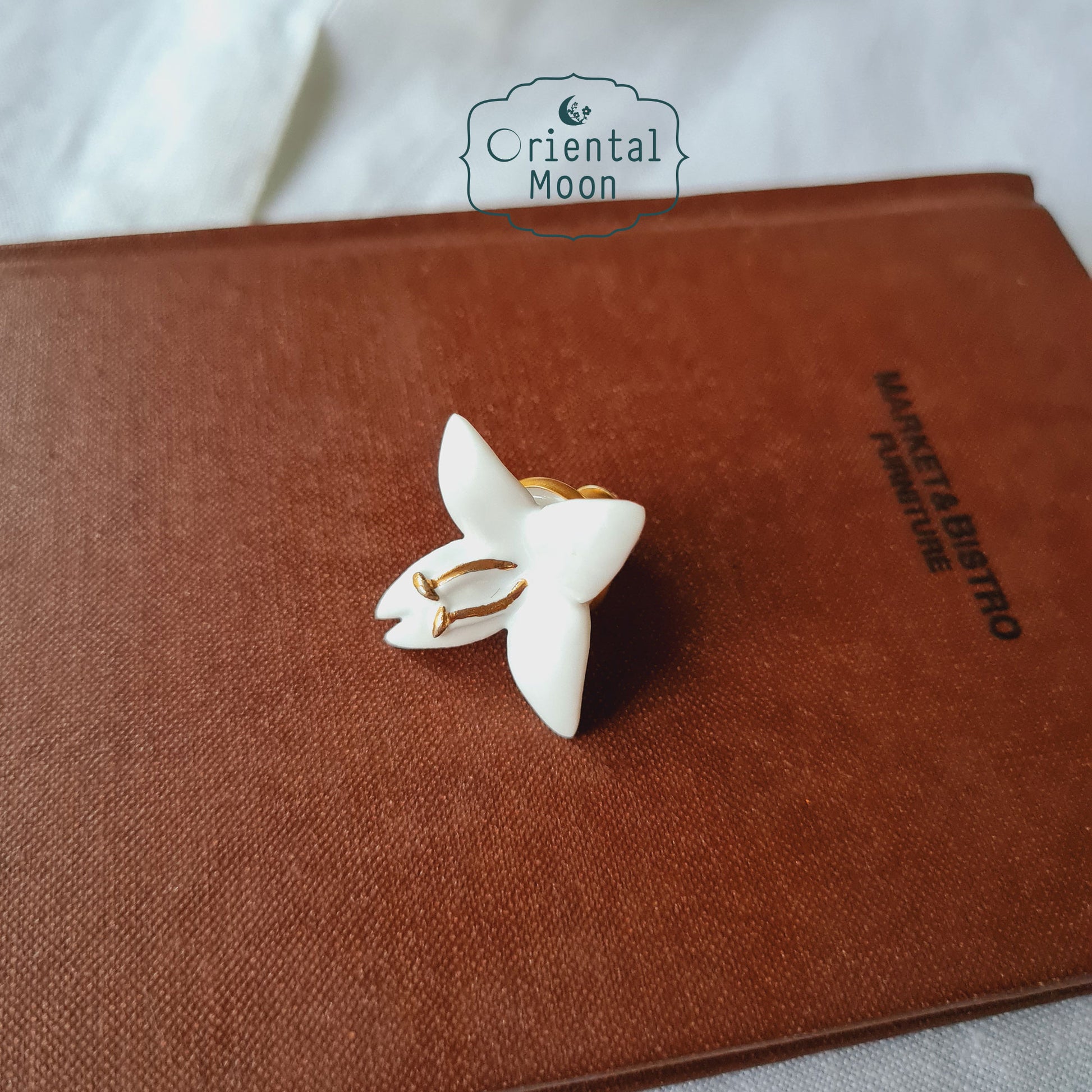 เข็มกลัดดอกปีบพอรซเลนปั้นมือ เกสรด้านในเขียนสีทอง