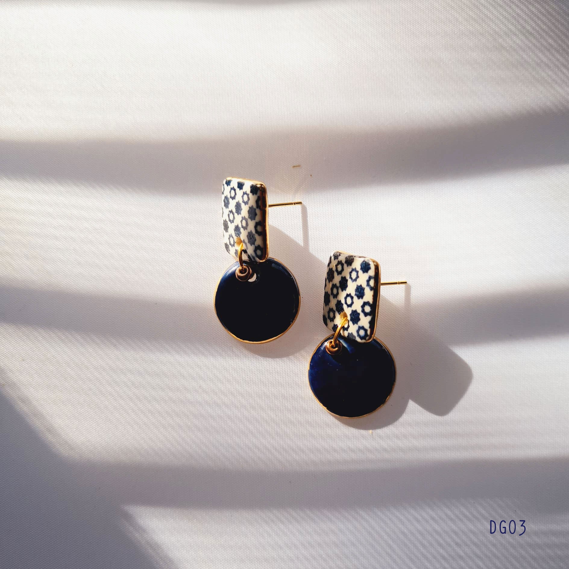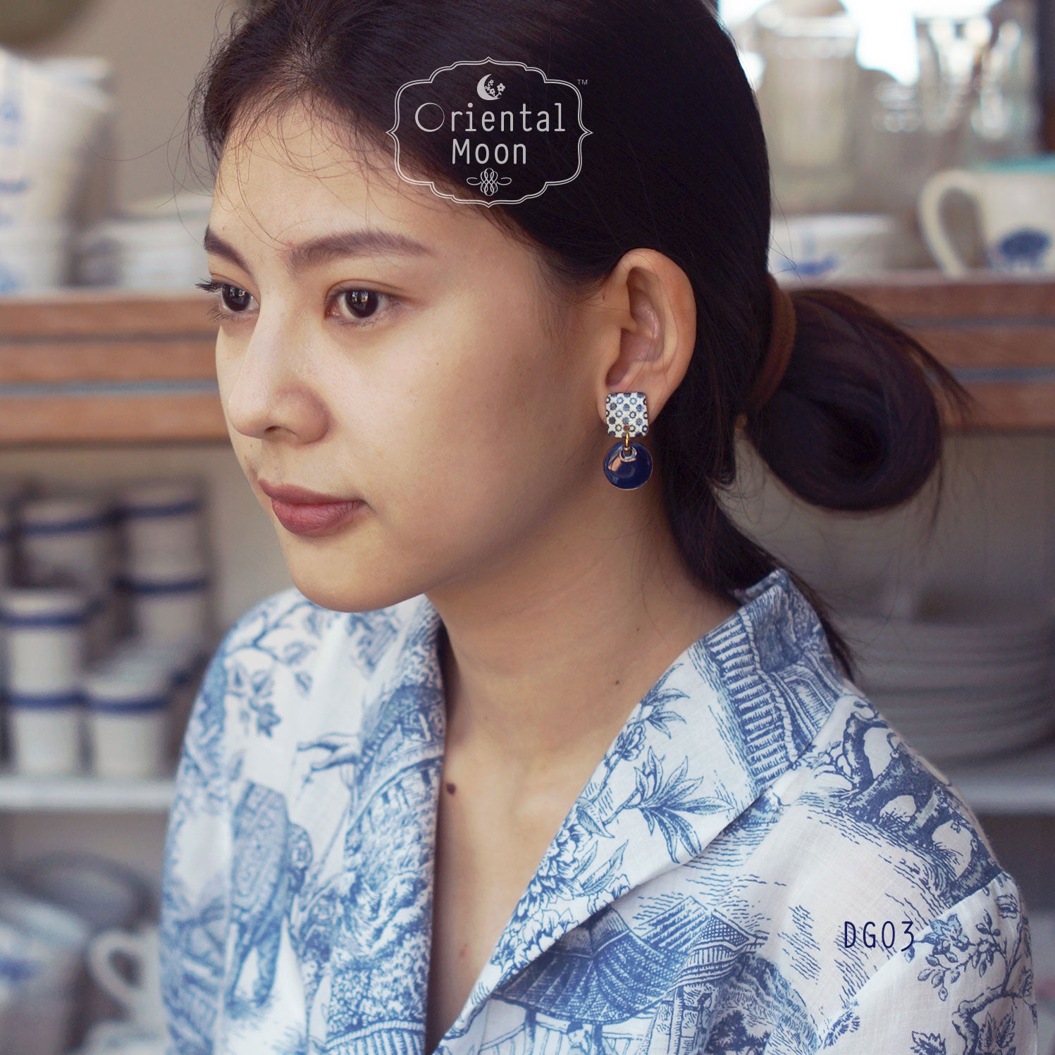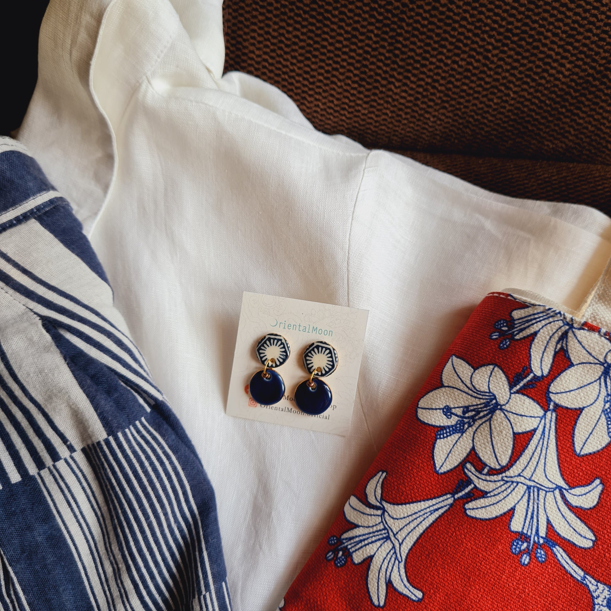 Two tier kram blue ceramic earrings ต่างหูระย้าสองชั้นสีน้ำเงินครามวนทอง( Pattern type)