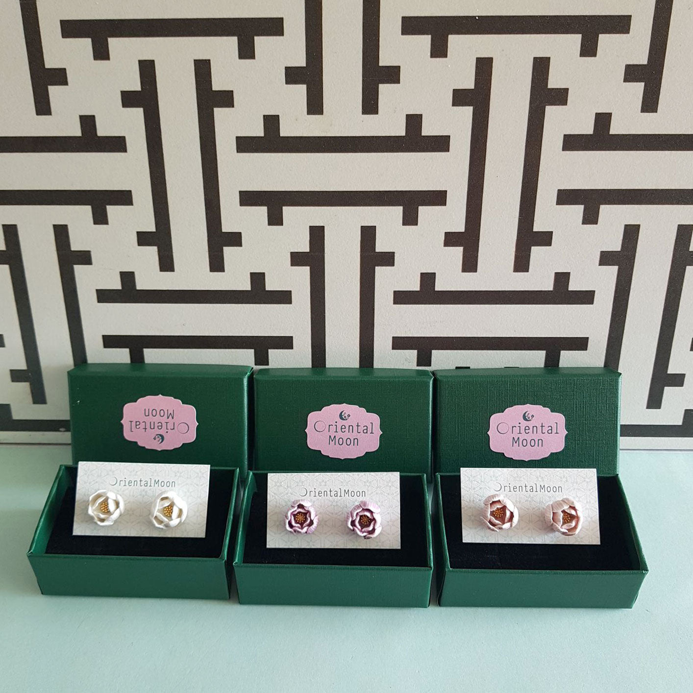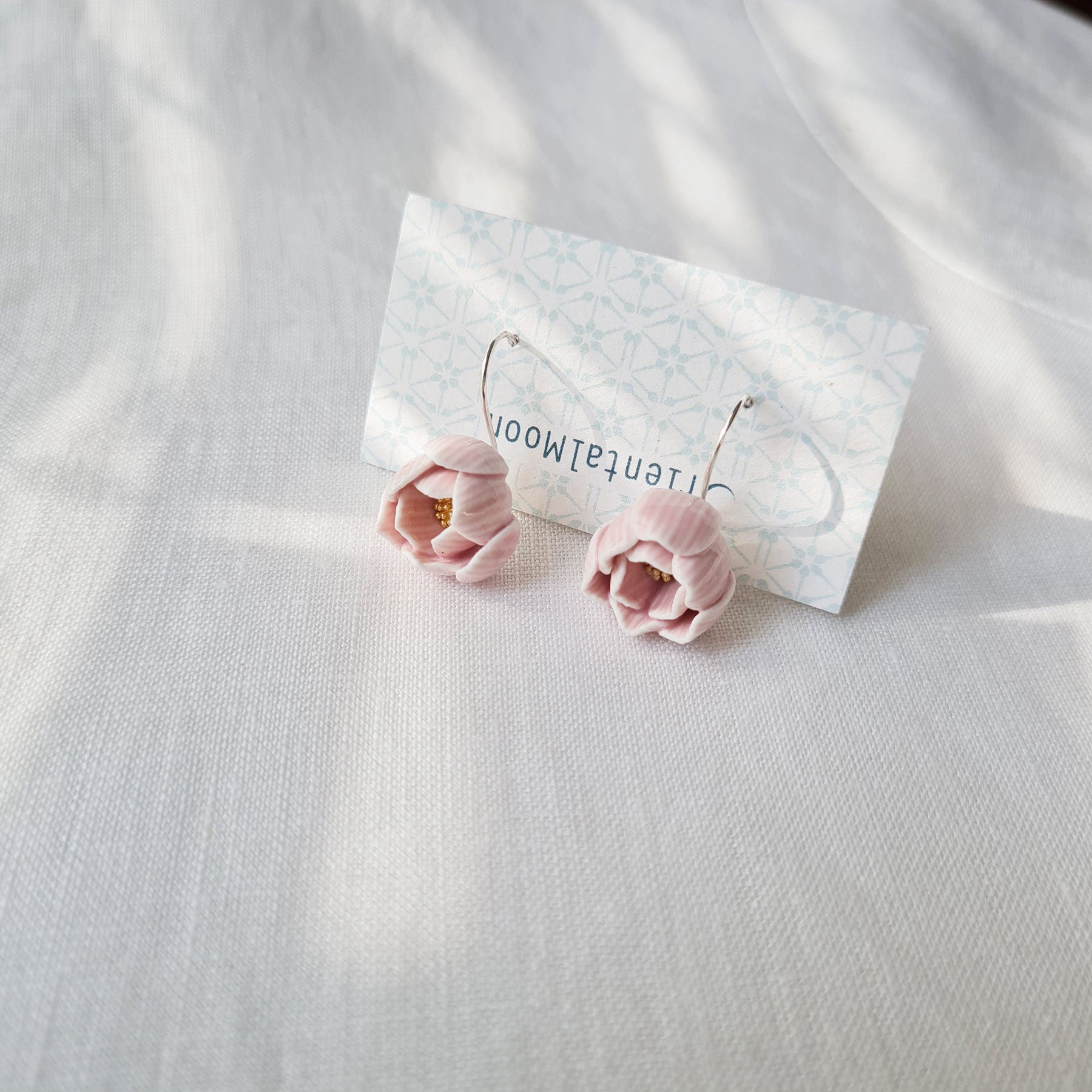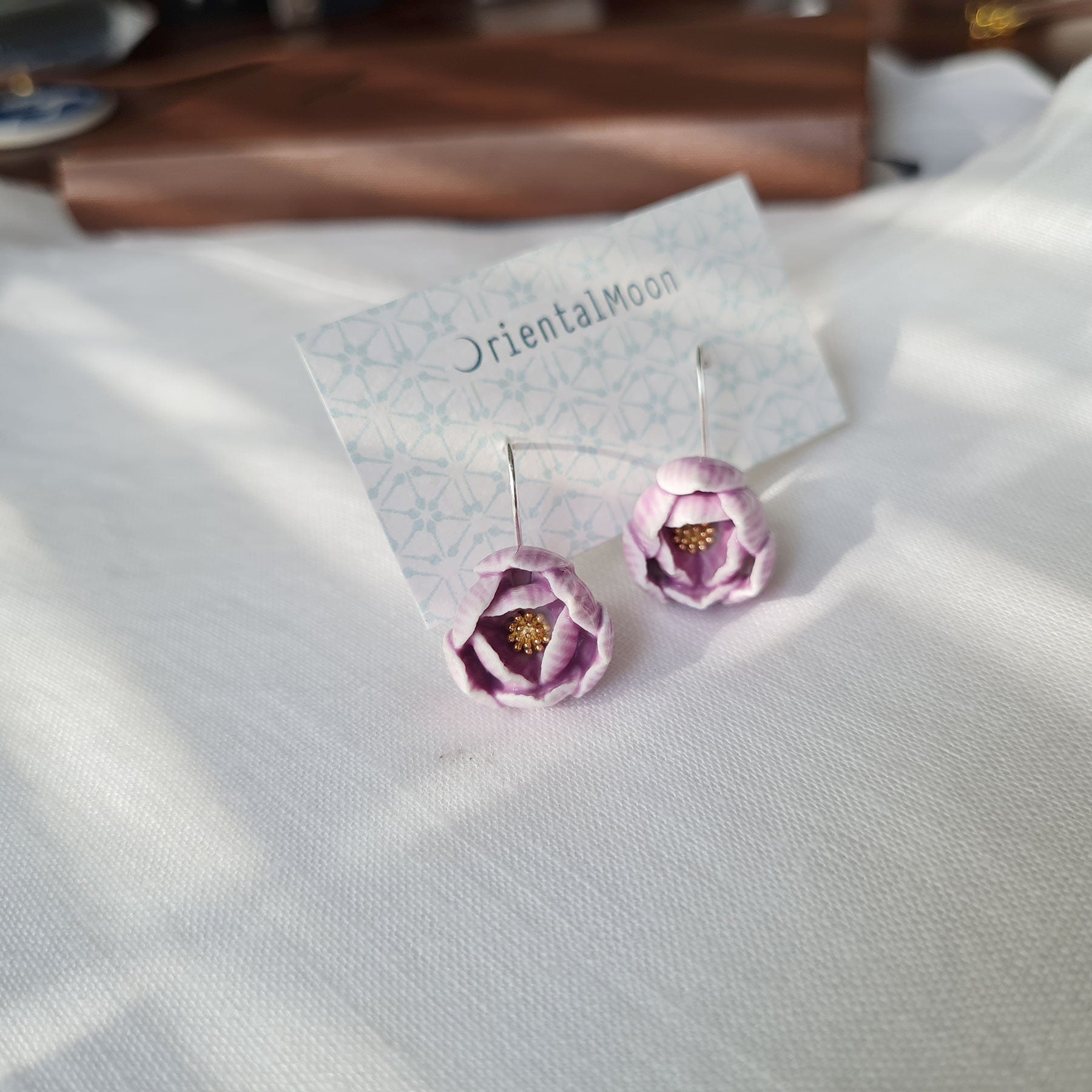 - *Blooming Lotus Earrings*: This model has a hook design with a round silver base.