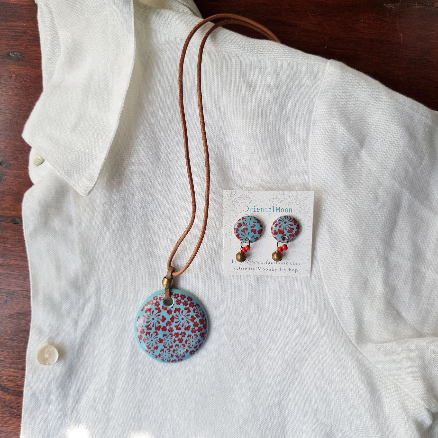 Red on green turquoise ceramic pendant set with earrings OM12 ชุดสร้อยคอจี้เซรามิคพร้อมต่างหู06