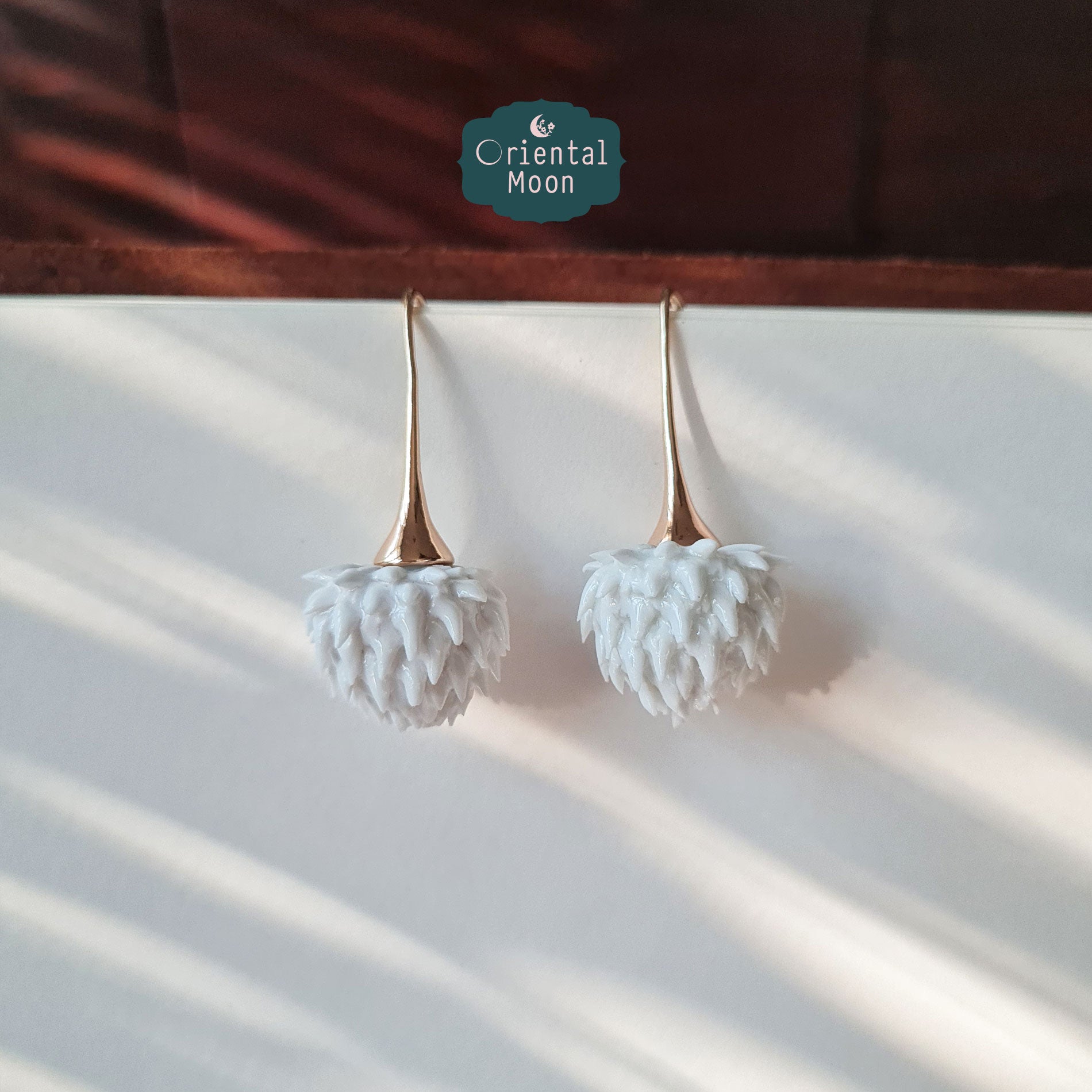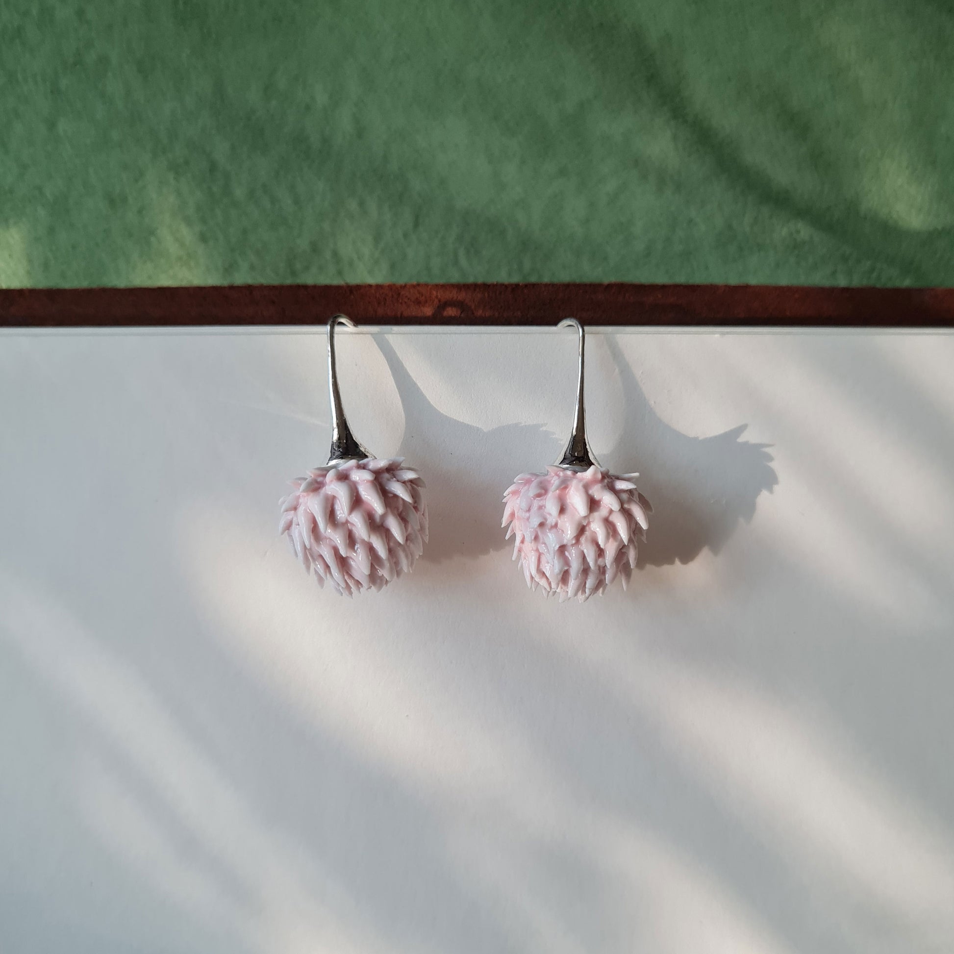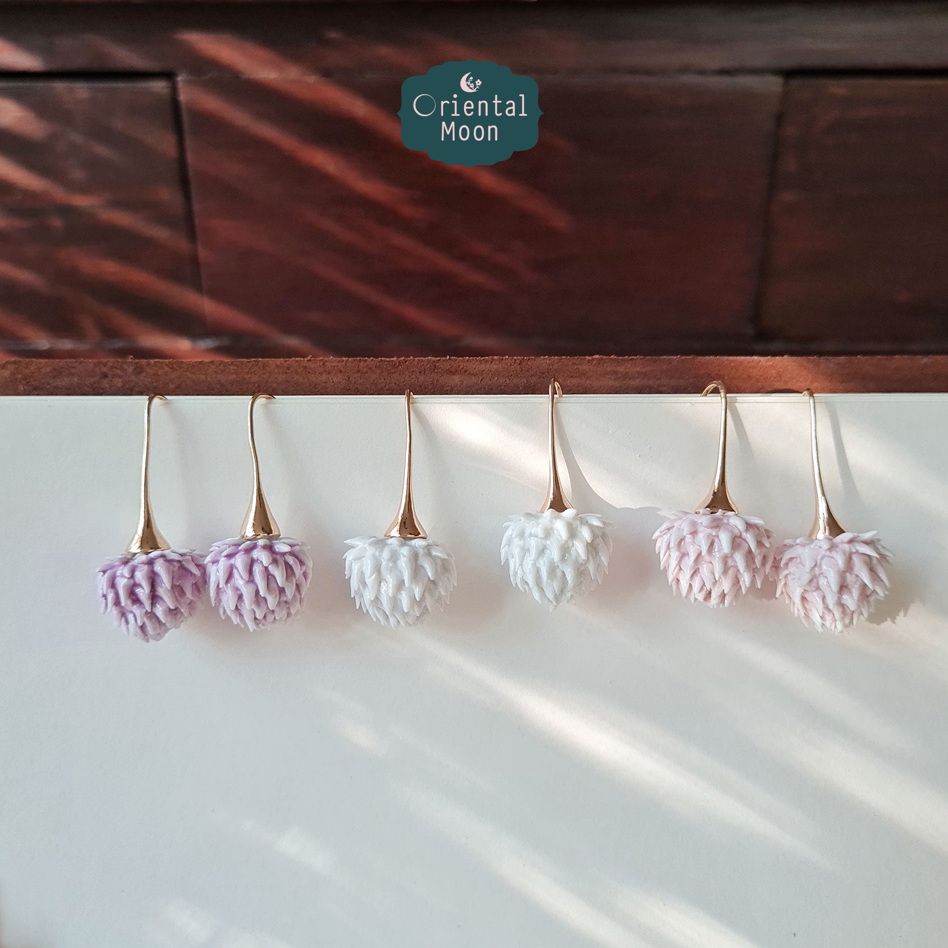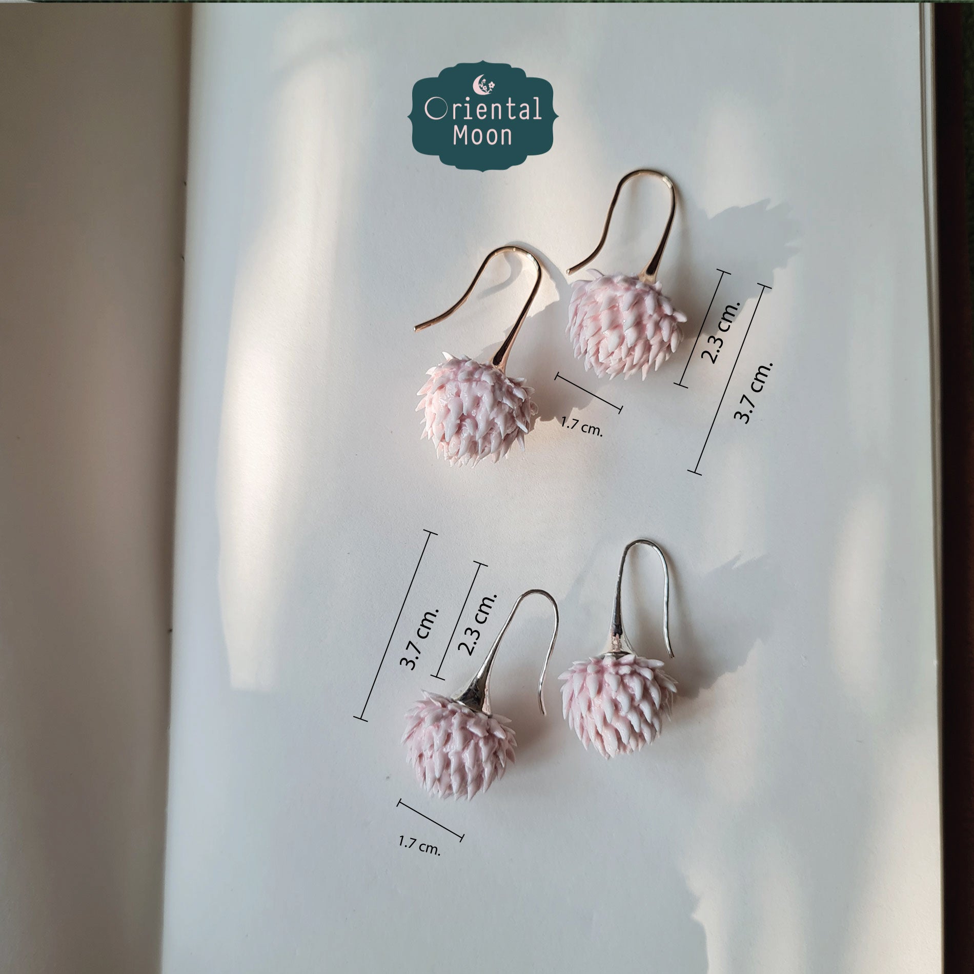 ดีไซน์เป็นต่างหูห้อยทรงปอม – ก้านเกี่ยวมีฐานทรงกรวยเล็ก เพื่อโชว์ตัวดอกชัดขึ้น