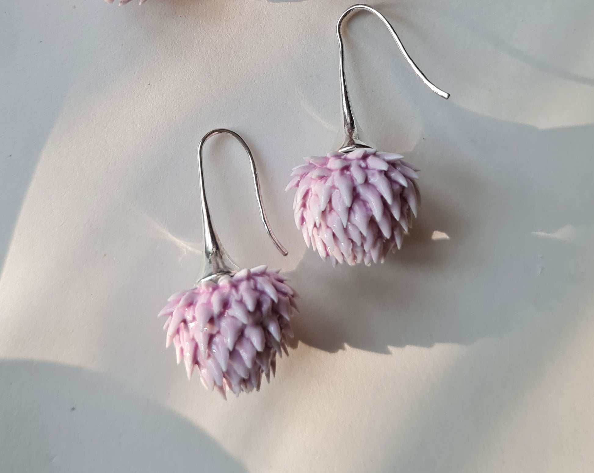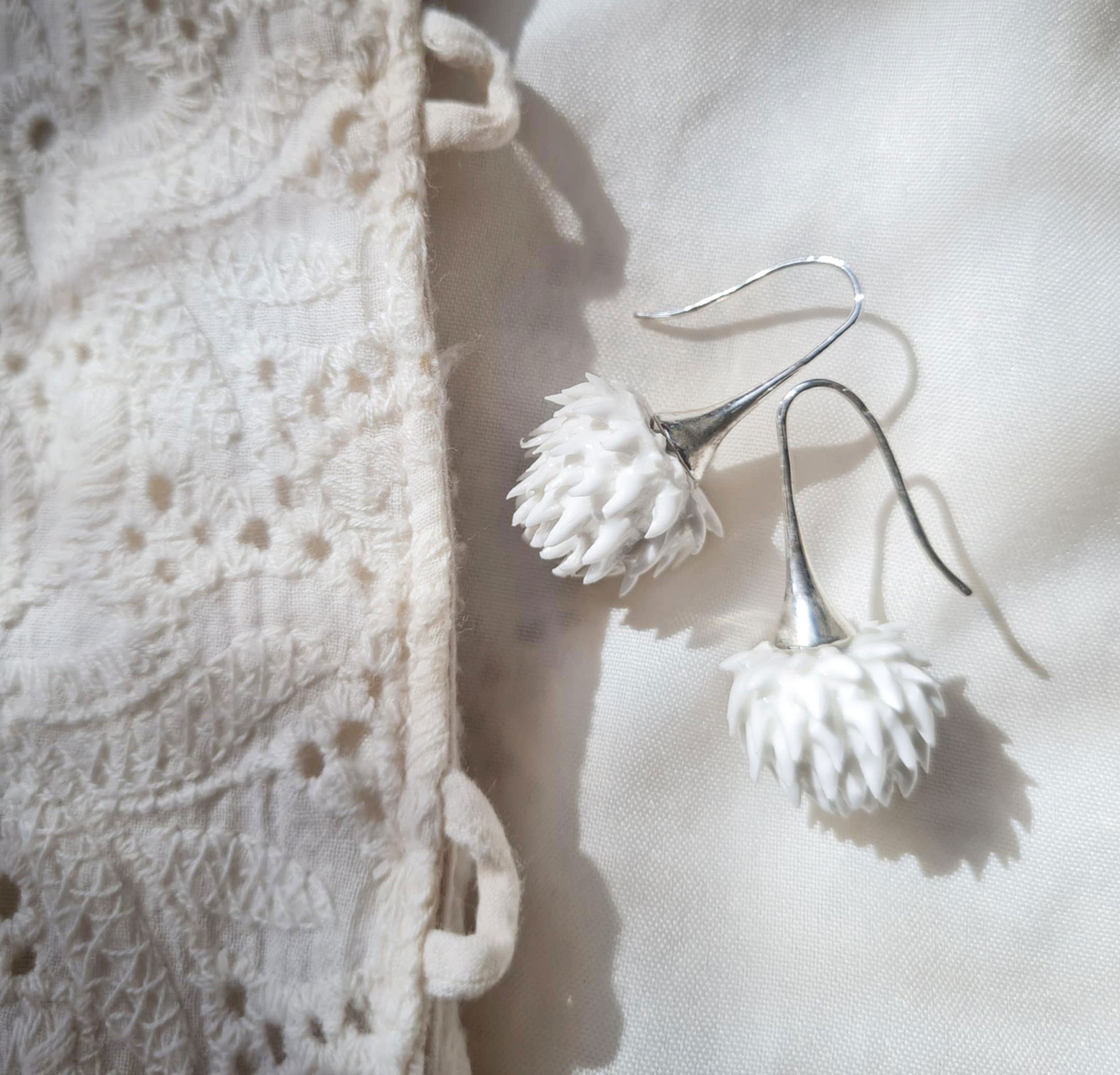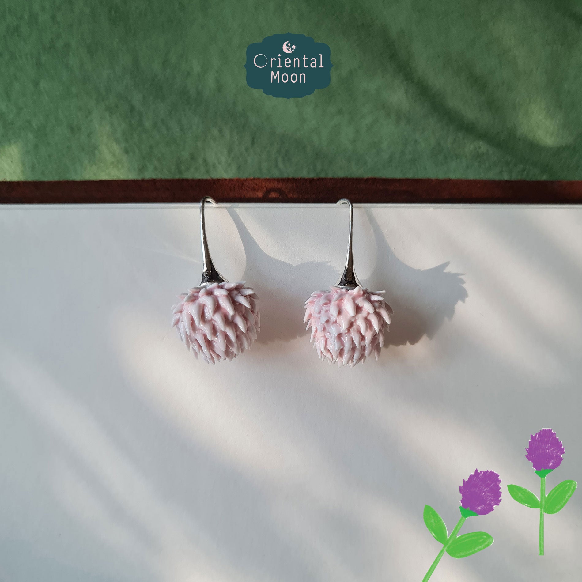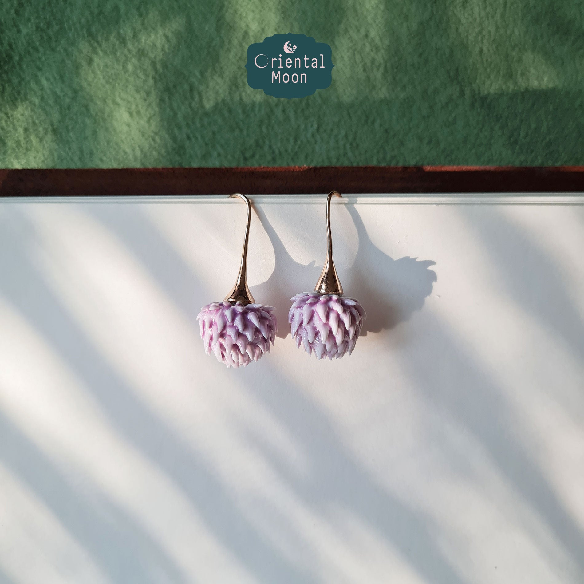 ดีไซน์เป็นต่างหูห้อยทรงปอม – ก้านเกี่ยวมีฐานทรงกรวยเล็ก เพื่อโชว์ตัวดอกชัดขึ้น