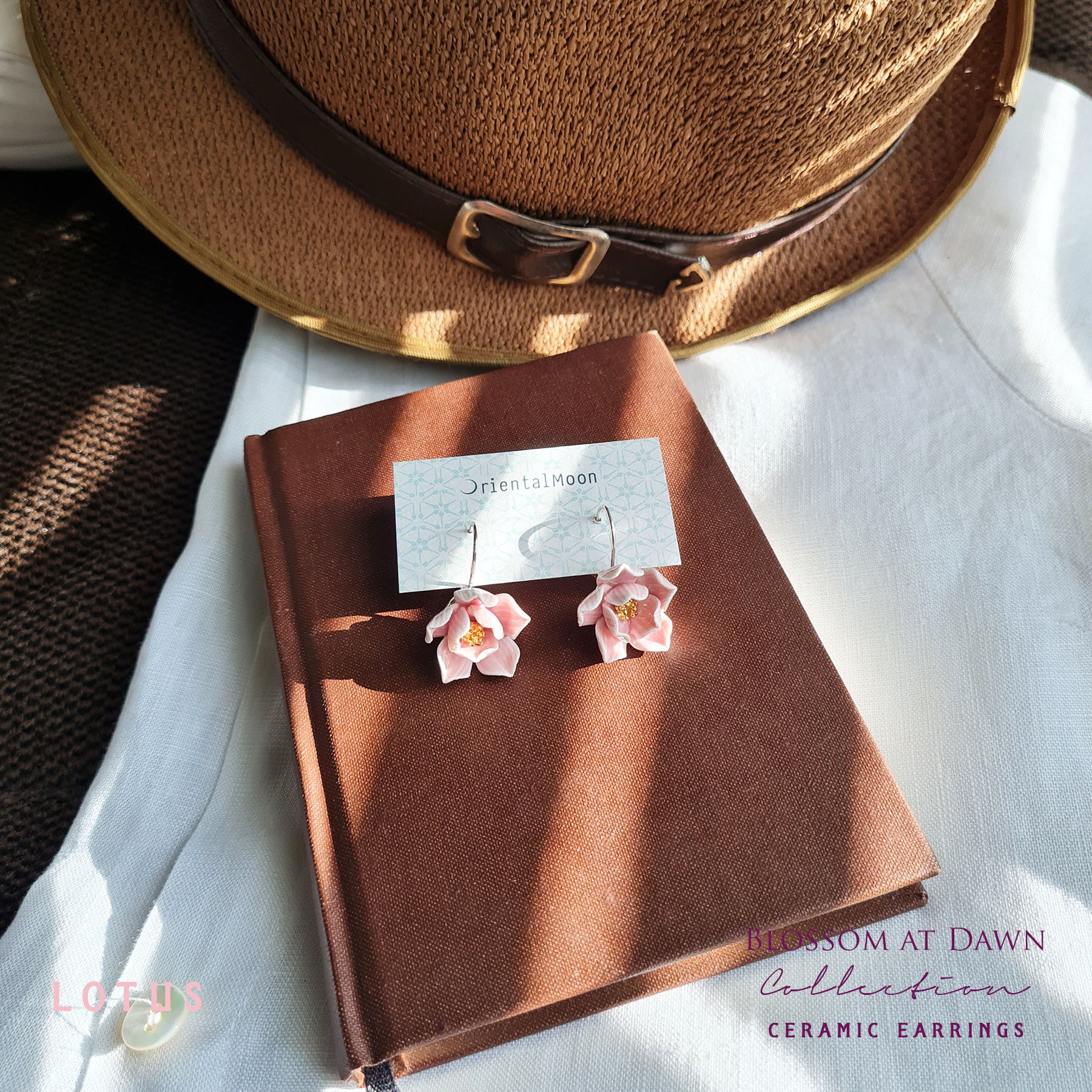 - *Blooming Lotus Earrings*: This model has a hook design with a round silver base.