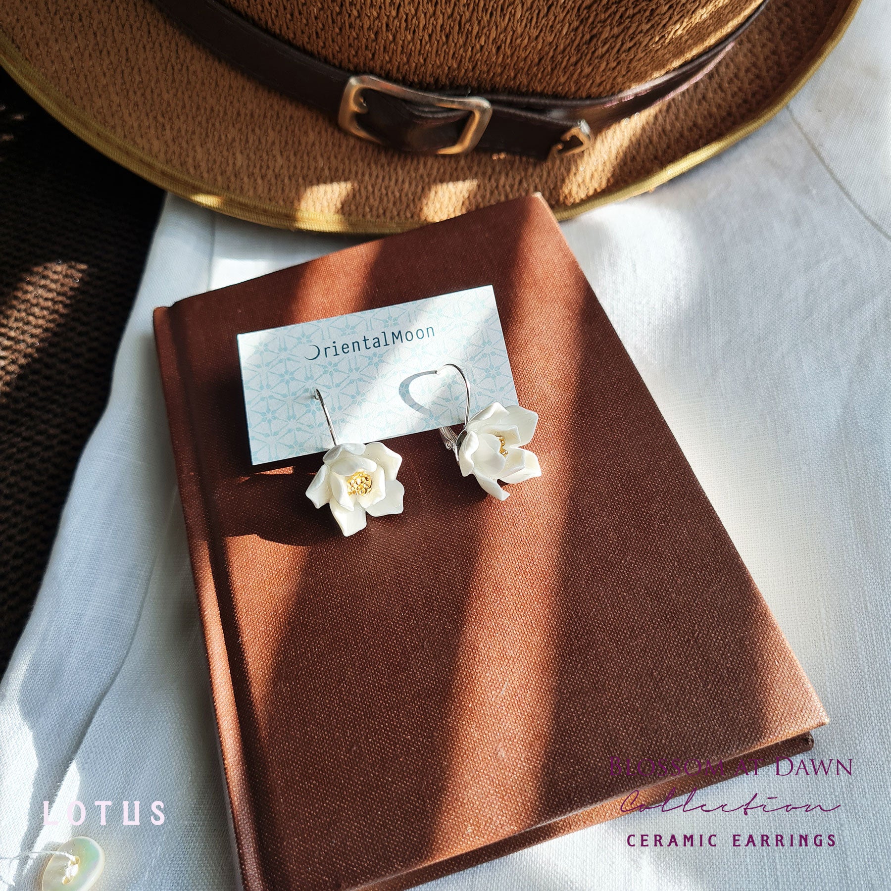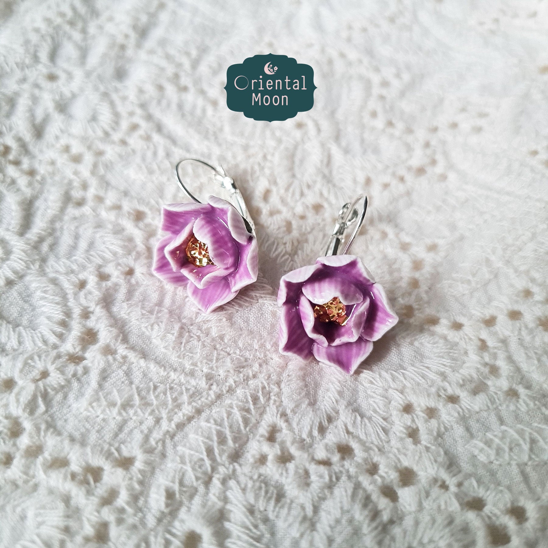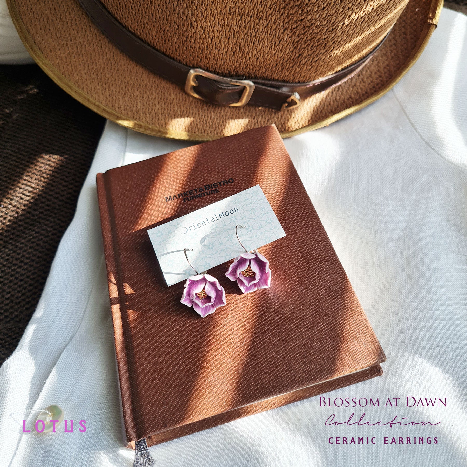 Lotus porcelain hanging earrings with a 925 sterling silver circular base